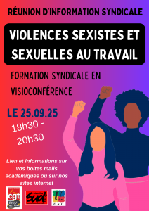 La CGT éduc'action, la FSU et SUD éducation organisent une réunion d'information syndicale sur les violences sexistes et sexuelles au travail le jeudi 25 septembre de 18h30 à 20h30. Cette réunion se tiendra en visioconférence via le lien suivant : https://snuipp-fr.zoom.us/j/84620018118 .